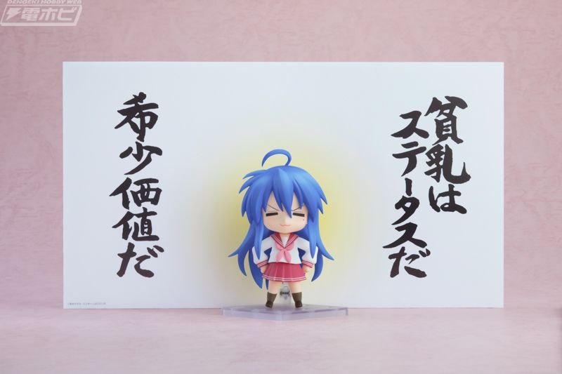 「笑顔」「どや顔」「きらきら顔」と3種の表情パーツが付属。オプションパーツとして大好物の「チョココロネ」や「コンプティーク」なども用意されているほか、こなたを代表するセリフ「貧乳はステータスだ 希少価値だ」をプリントした背景シートも! こなたの魅力を存分に楽しめる商品構成となっています。