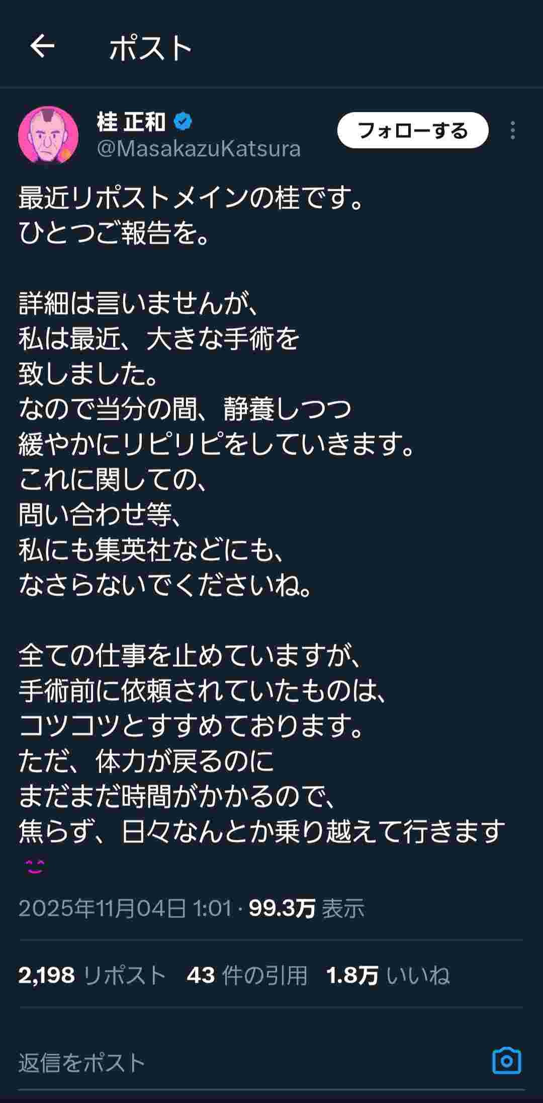 『ウイングマン』『電影少女』『I’s』などで知られる漫画家・桂正和氏(62)が4日、自身のXを更新し、大きな手術を行い静養中であることを発表した。