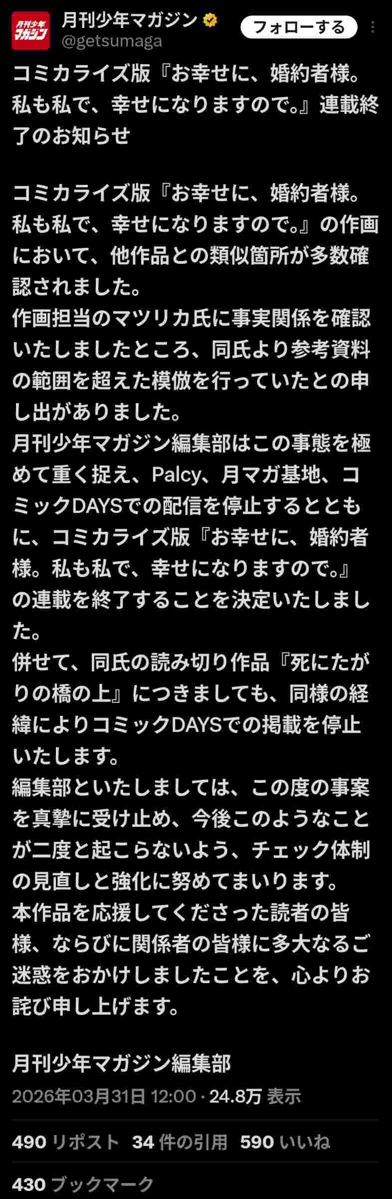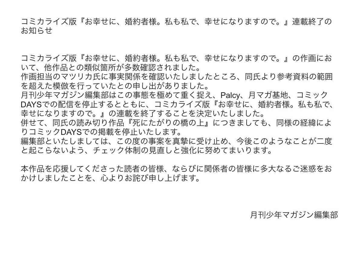 【コミカライズ版『お幸せに、婚約者様。私は私で、幸せになりますので。』連載終了のお知らせ】コミカライズ版『お幸せに、婚約者様。私は私で、幸せになりますので。』の作画において、他作品との類似箇所が多数確認されました。作画担当のマツリカ氏に事実関係を確認いたしましたところ、同氏より参考資料の範囲を超えた模倣を行っていたとの申し出がありました。月刊少年マガジン編集部はこの事態を極めて重く捉え、Palcy、月マガ基地、コミックDAYSでの配信を停止するとともに、コミカライズ版『お幸せに、婚約者様。私は私で、幸せになりますので。』の連載を終了することを決定いたしました。併せて、同氏の読み切り作品『死にたがりの橋の上』につきましても、同様の経緯によりコミックDAYSでの掲載を停止いたします。編集部といたしましては、この度の事案を真摯に受け止め、今後このようなことが二度と起こらないよう、チェック体制の見直しと強化に努めてまいります。本作品を応援してくださった読者の皆様、ならびに関係者の皆様に多大なるご迷惑をおかけいたしましたことを、心よりお詫び申し上げます。全7話