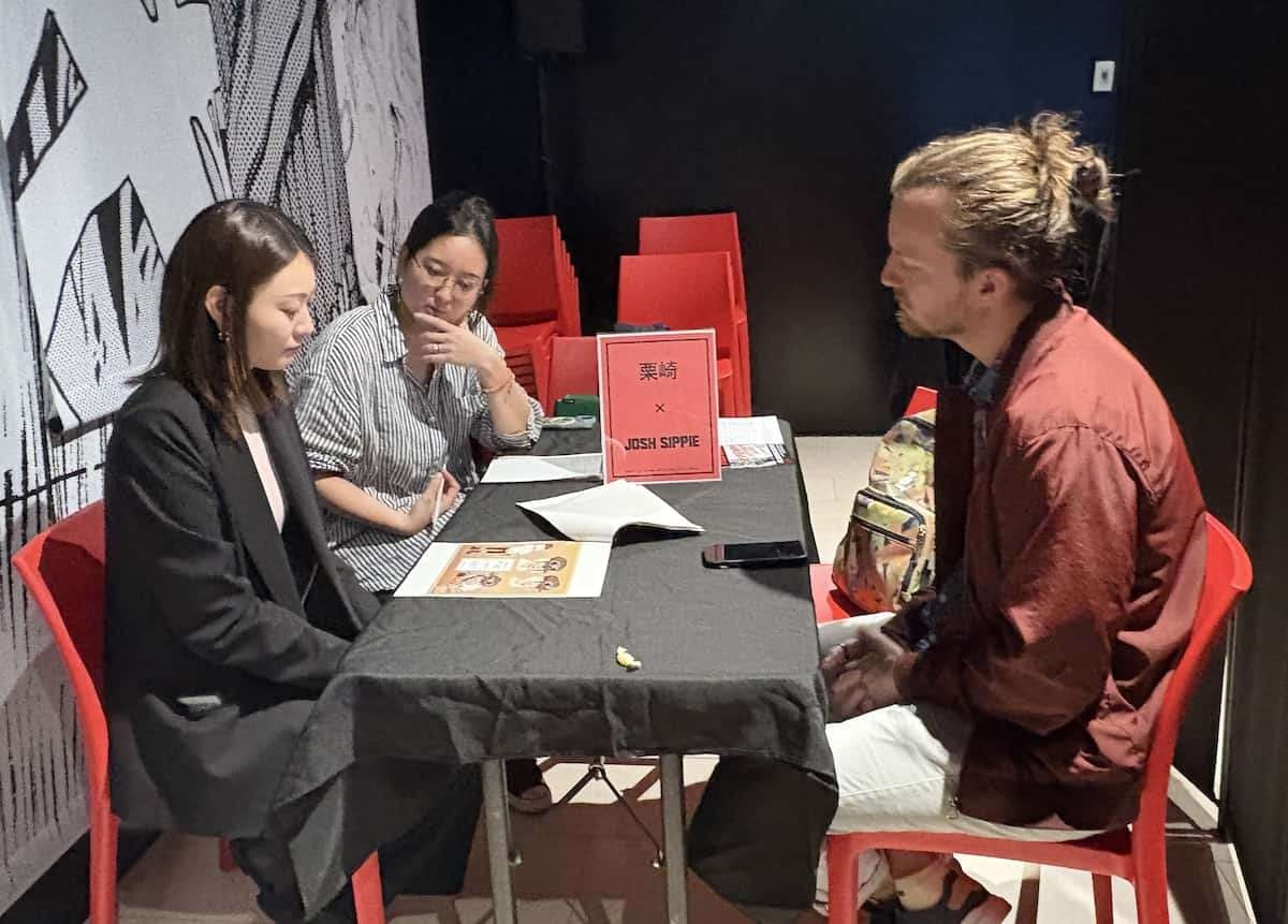 講談社による漫画の「持ち込み」イベントに参加した漫画家志望者(右)と、原稿を読む編集者ら=10月、米ニューヨーク(本間英士撮影)