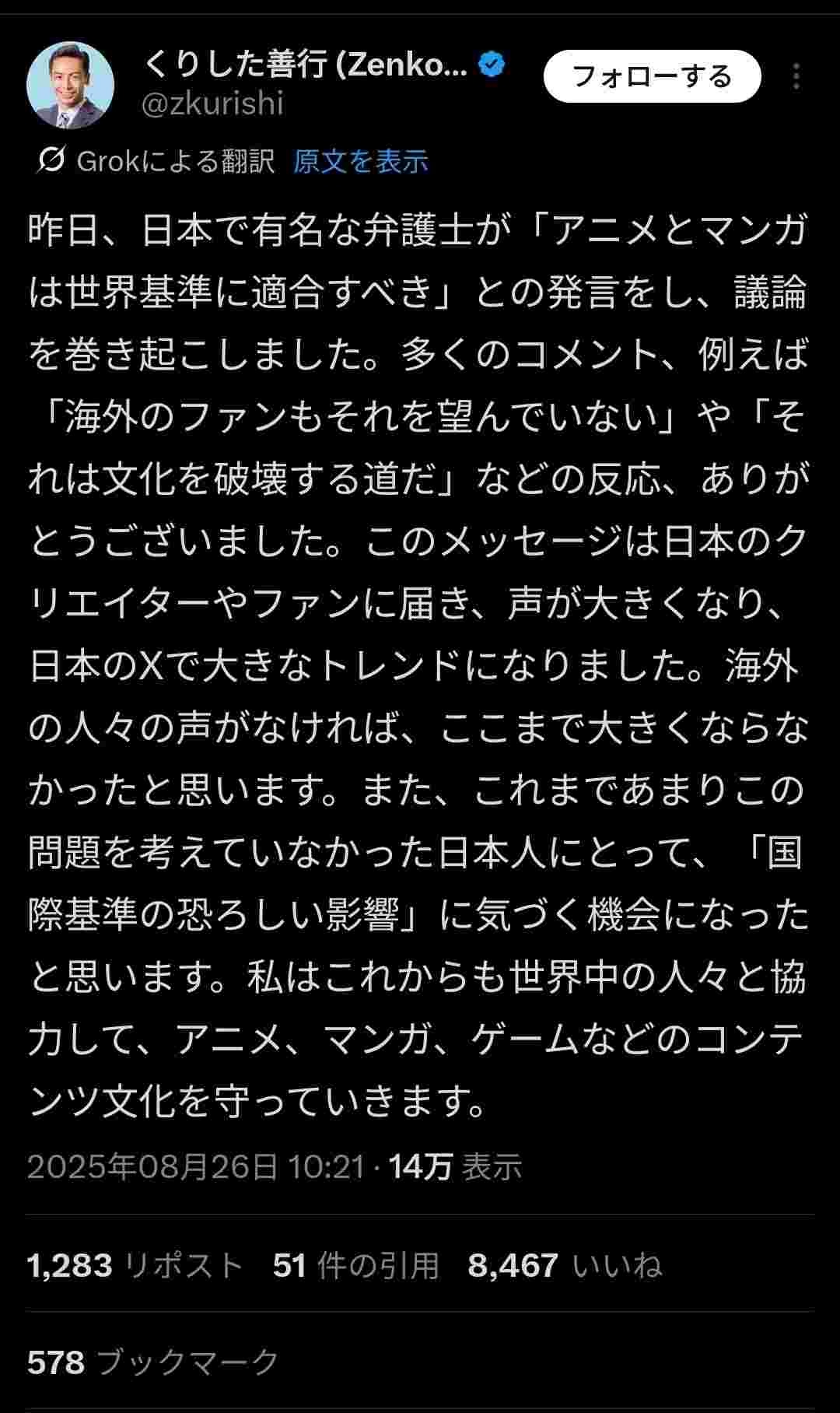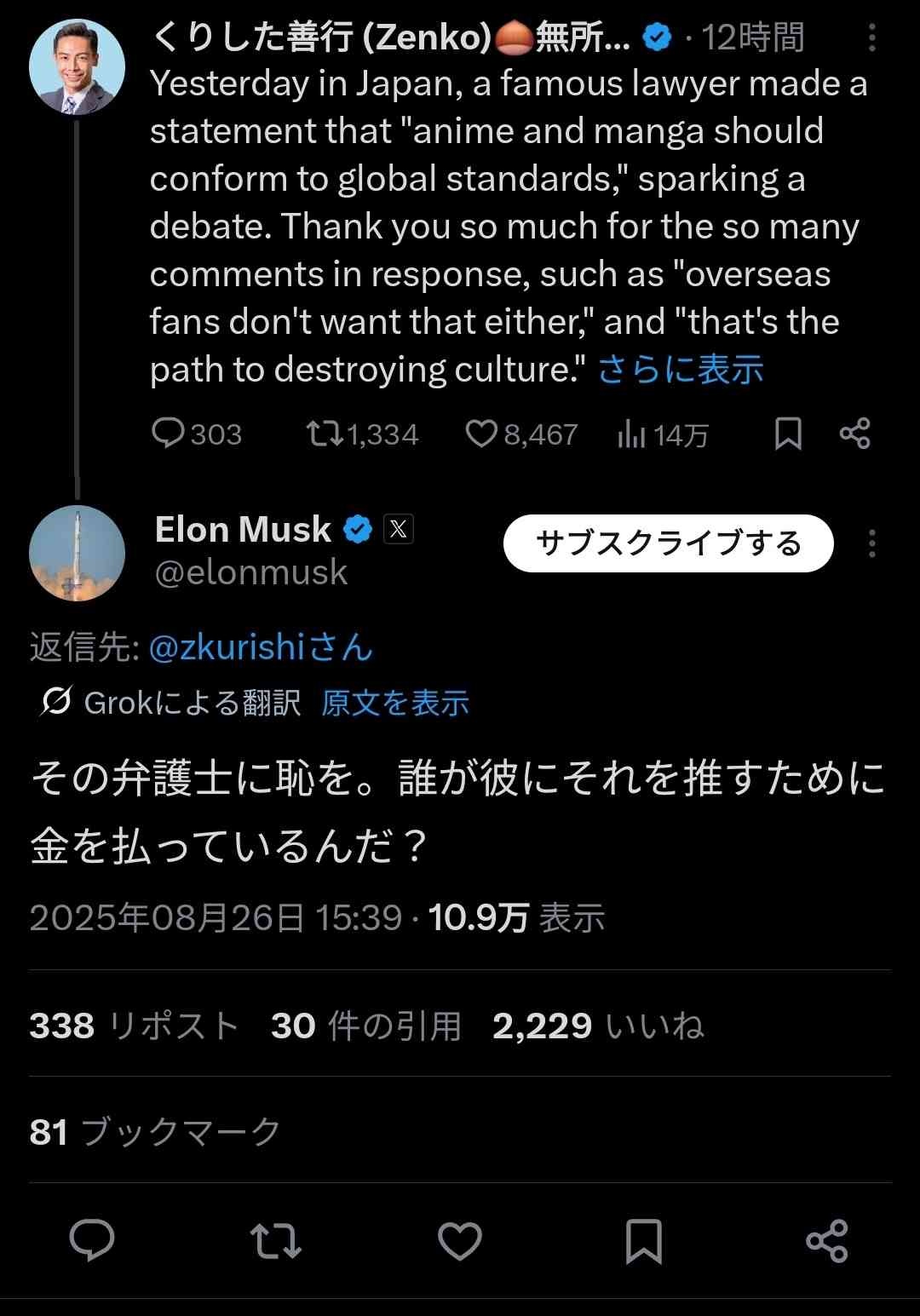 イーロン・マスクがアニメ漫画は国際基準に合わせるべきではない!俺がアニメ文化を守る!とブチギレ