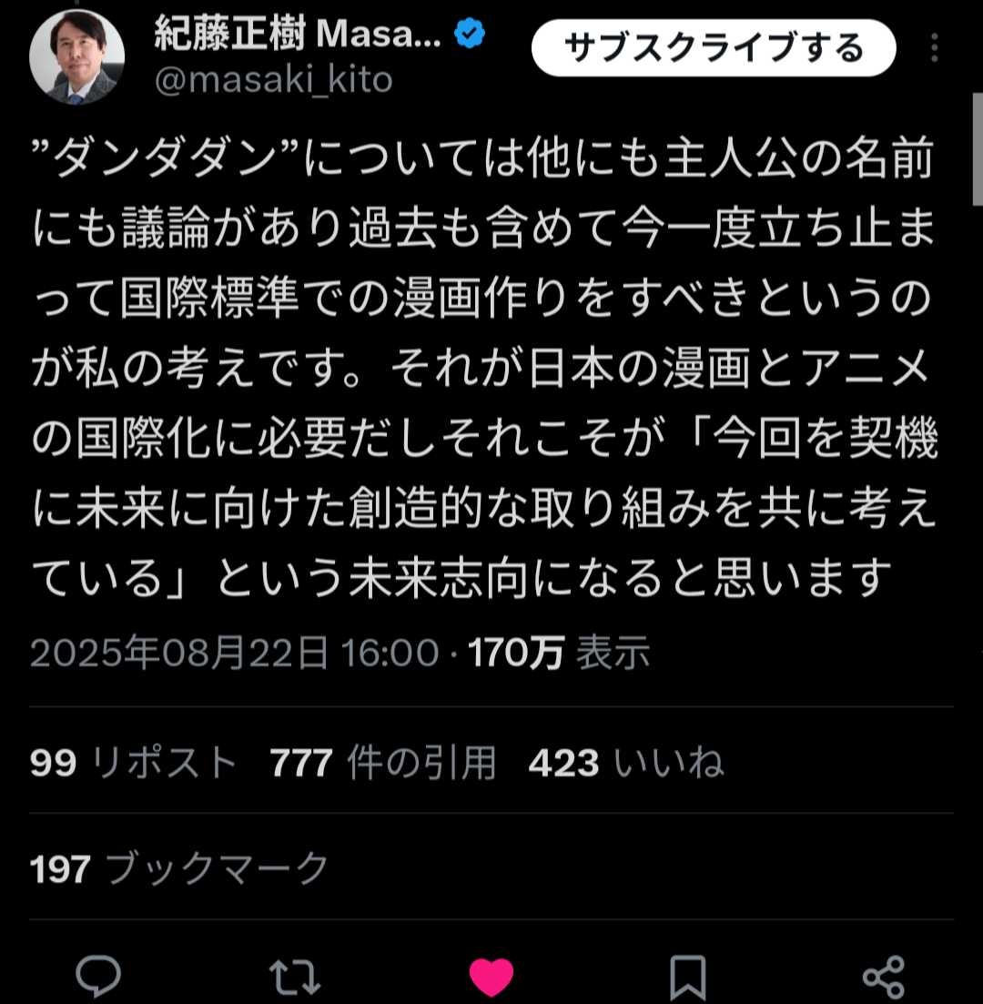「これはフィクションだから」って言って、どんな差別的な表現でも許されるって風潮が、一部にあった。その結果、表現の自由を振りかざして、現実の社会にいる人たちを傷つけるような作品も出てくる。だから、紀藤弁護士の言う「国際基準化」っていうのは、ちょっと強引かもしれないけど、「表現の自由の裏にある、社会への責任」を考えさせるきっかけにはなるんじゃないですかね。「表現の自由」を主張するなら、その自由が持つ「刃」が、誰かを傷つけてないか、ちゃんと自覚すべきだと思いますよ。