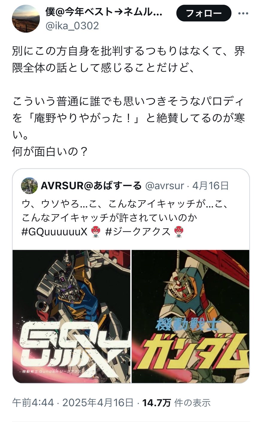 識者「ガンダムジークアクス、誰もが思いつくパロディを『庵野やりやがった!』と絶賛されるの寒い」