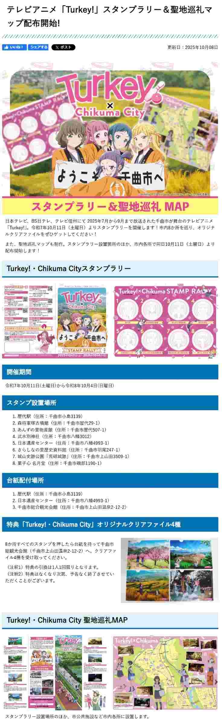 テレビアニメ「Turkey!」スタンプラリー&聖地巡礼マップ配布開始!|千曲市日本テレビ、BS日テレ、テレビ信州にて 2025年7月から9月まで放送された千曲市が舞台のテレビアニメ「Turkey!」...www.city.chikuma.lg.jpまあ事前に内容知ってたの市長だけだったみたいだから仕方ないね