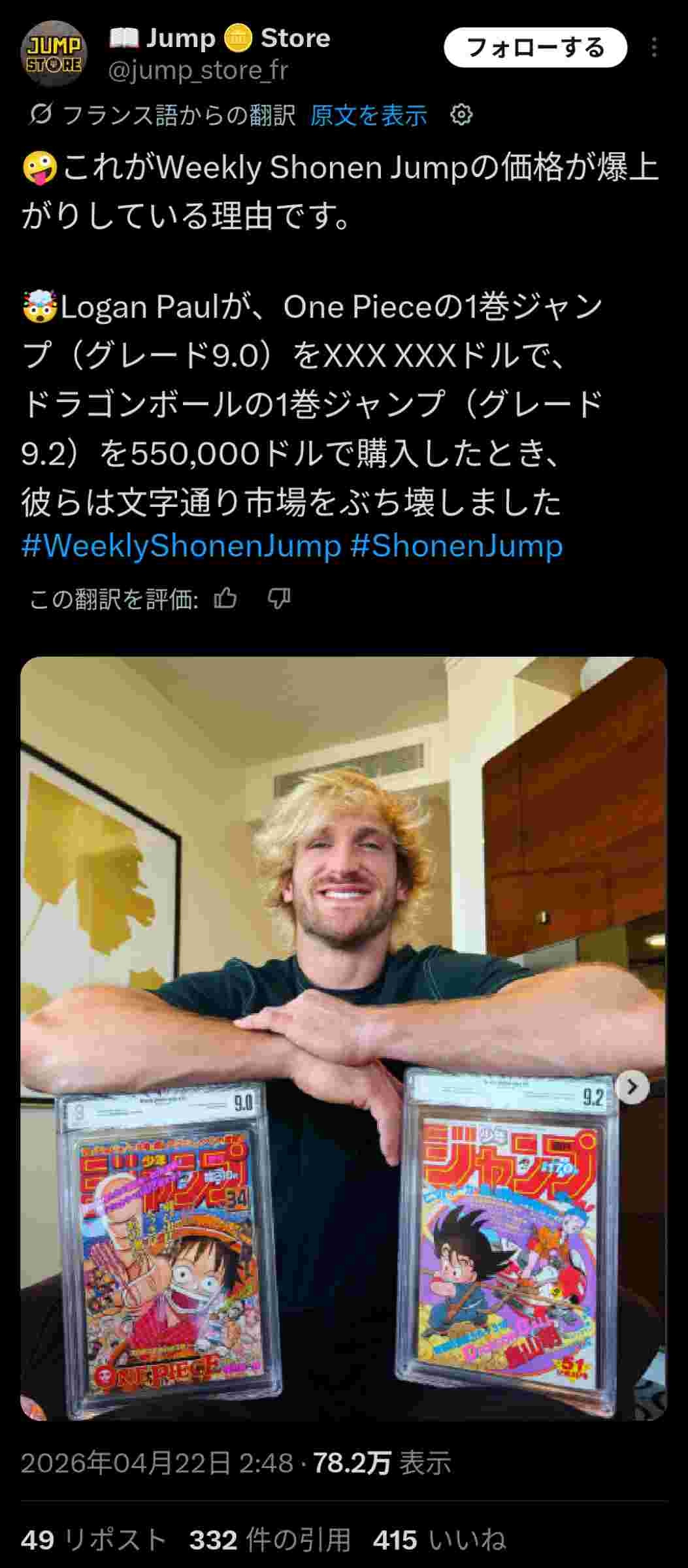 週刊少年ジャンプの値段が上がっている理由、ローガンポールが爆買いしたからだったwww