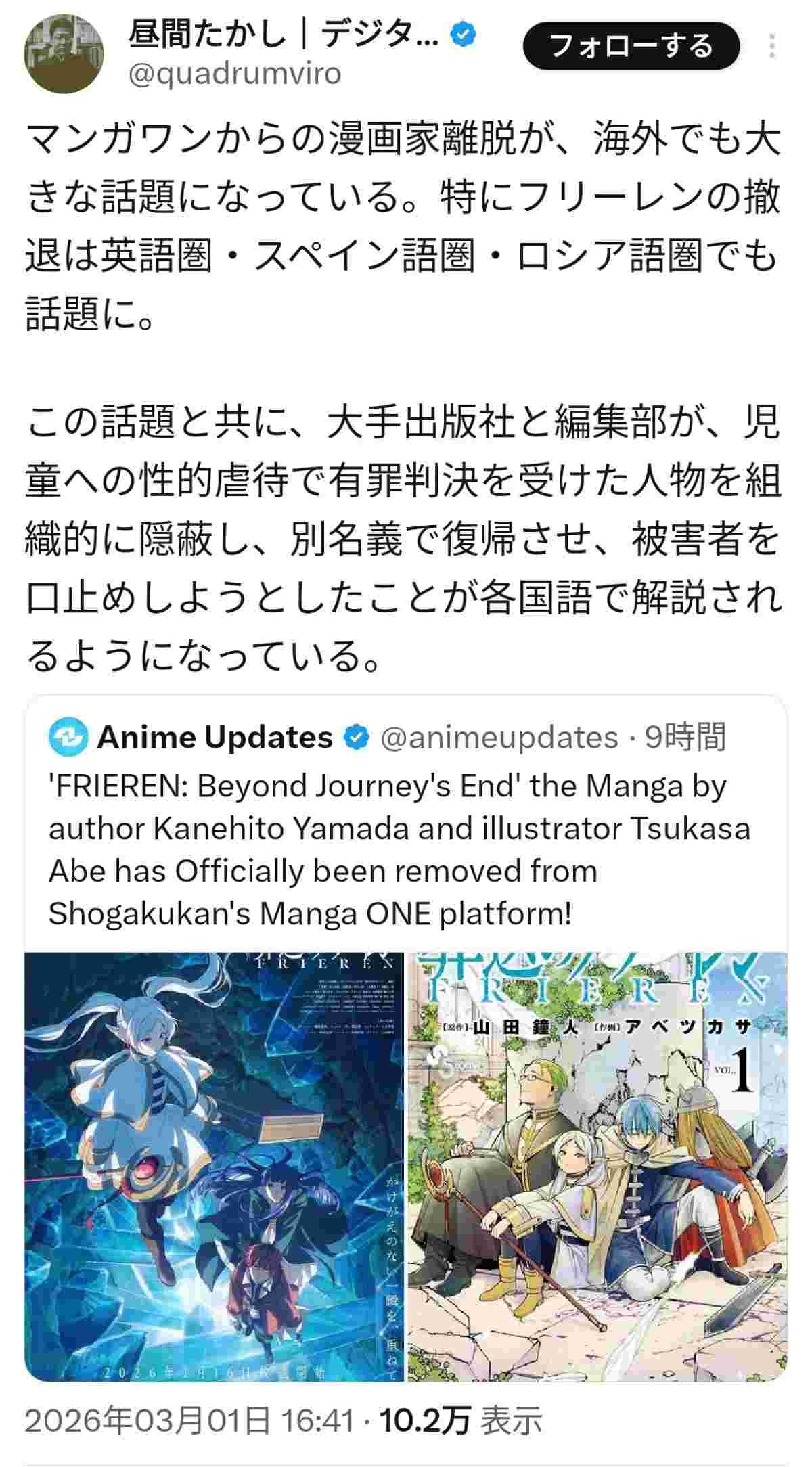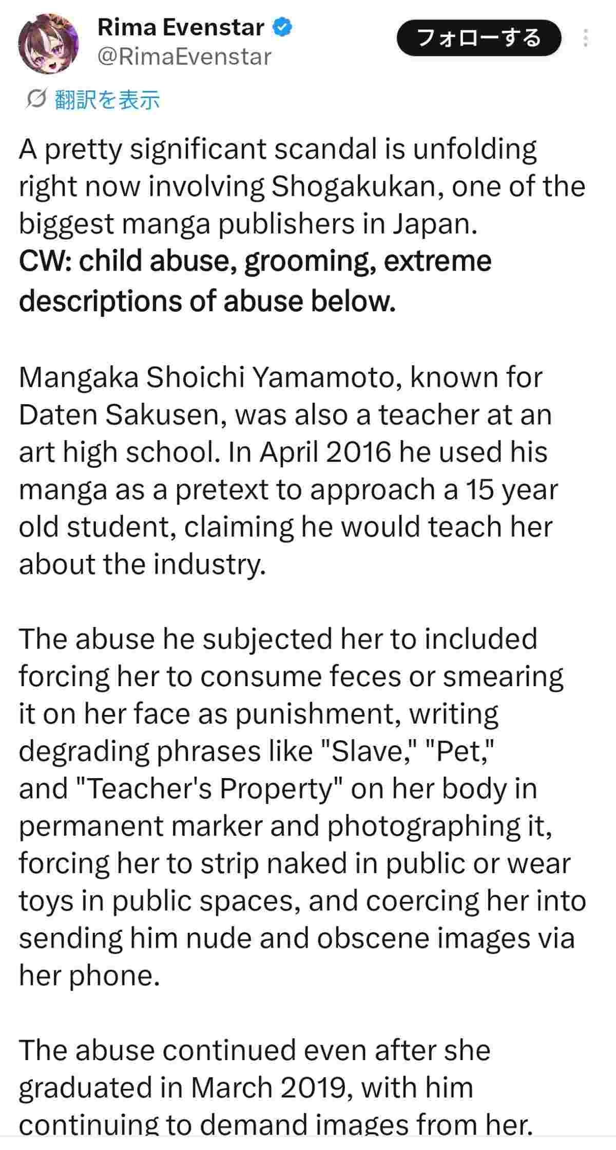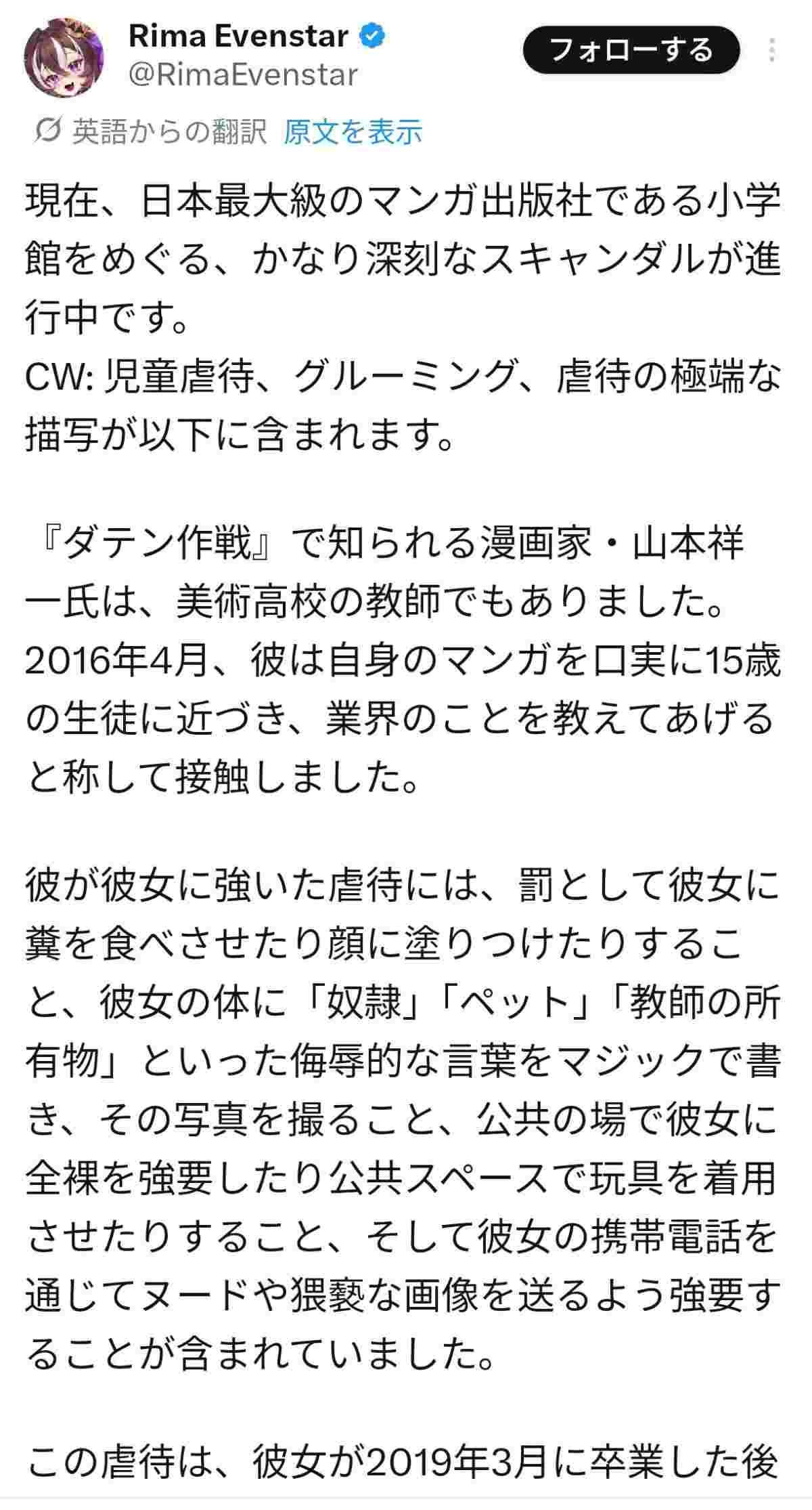 小学館の漫画プラットフォーム「マンガワン」でホストされていた彼女の漫画作品をすべて削除した」と投稿。