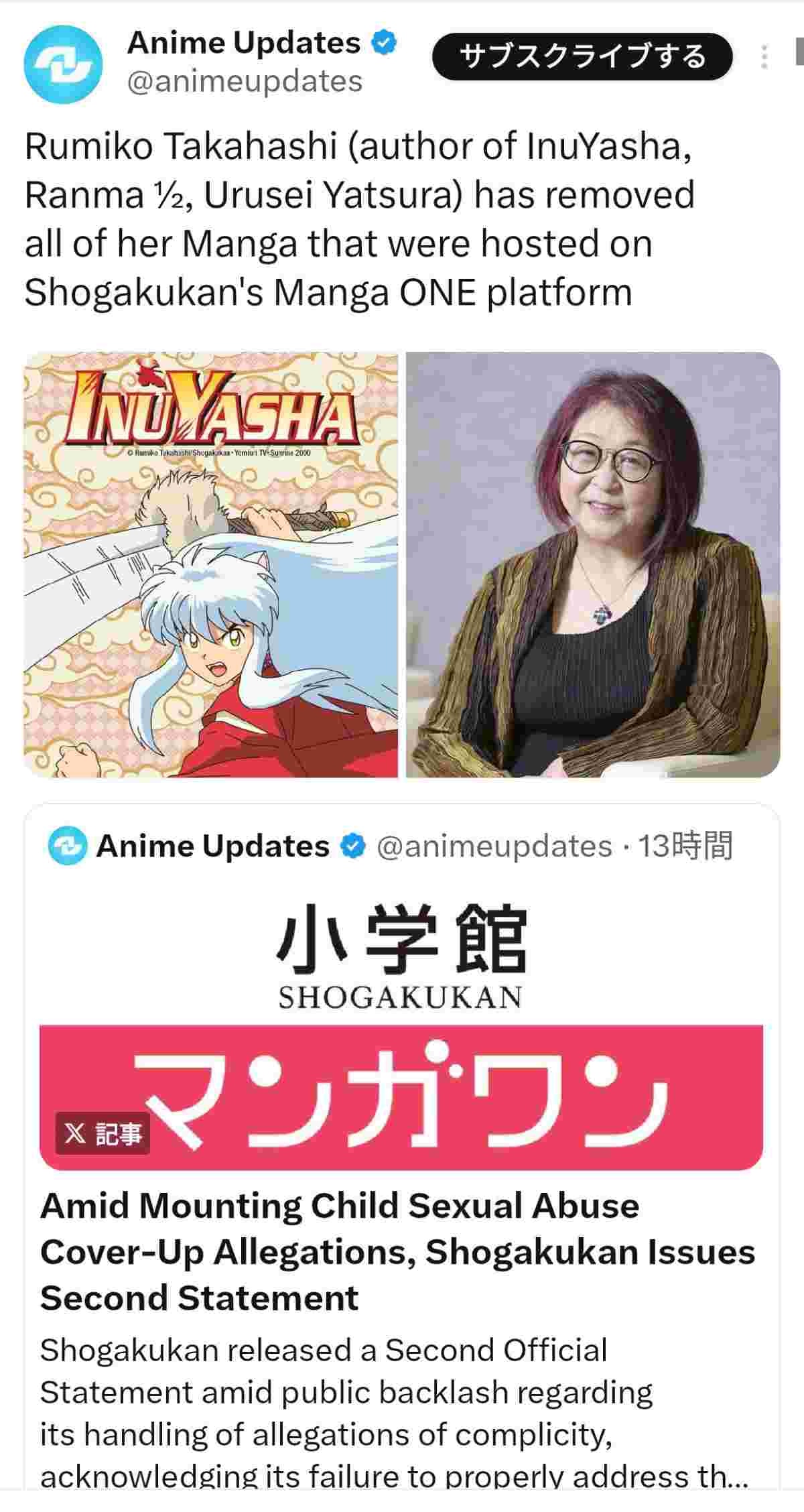これを受け、日本のアニメや漫画の情報を扱う海外メディア「Anime Updates」も反応。公式X(旧ツイッター)で「高橋留美子(『犬夜叉』『らんま1/2』『うる星やつら』の作者)は、