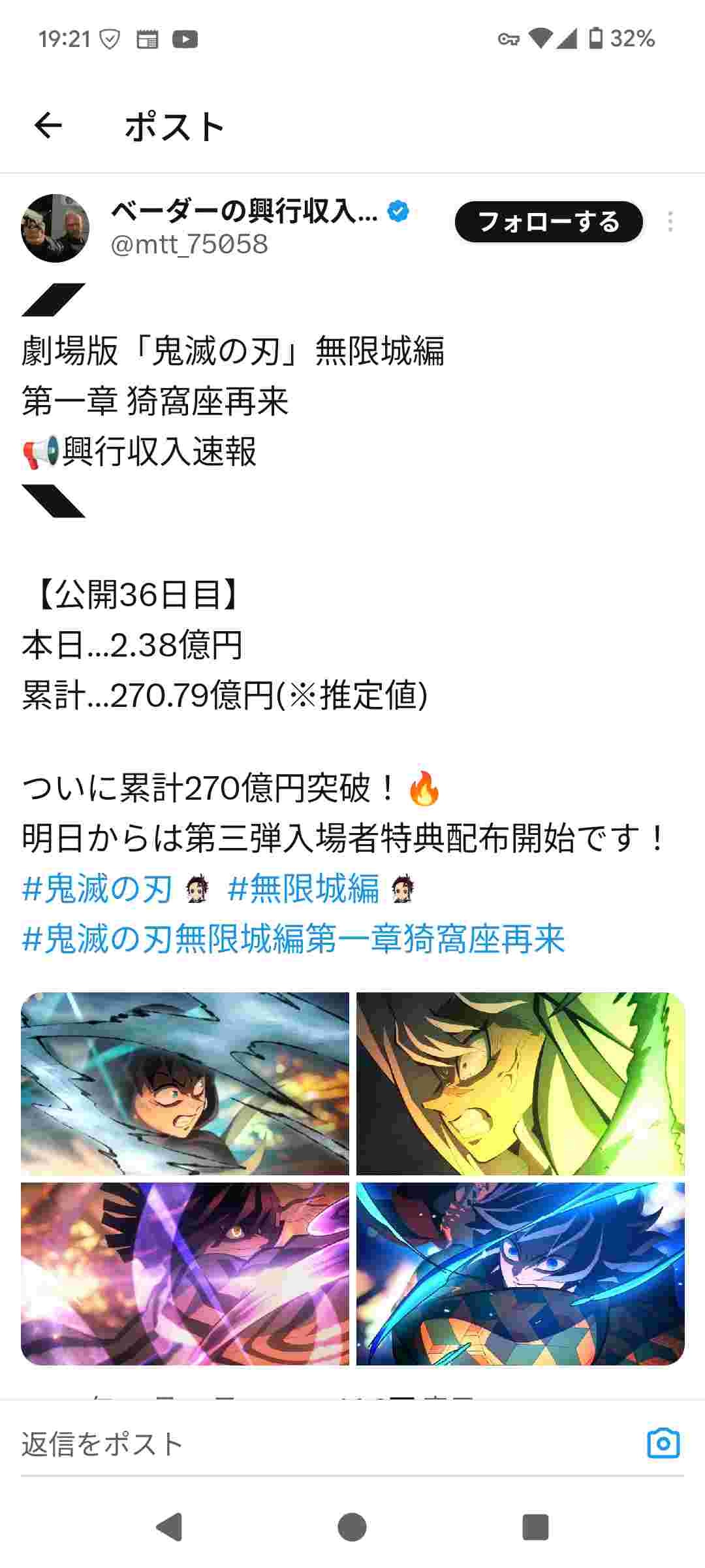 鬼滅の刃 無限城編、興行収入が270億円を突破!尾田くん…
