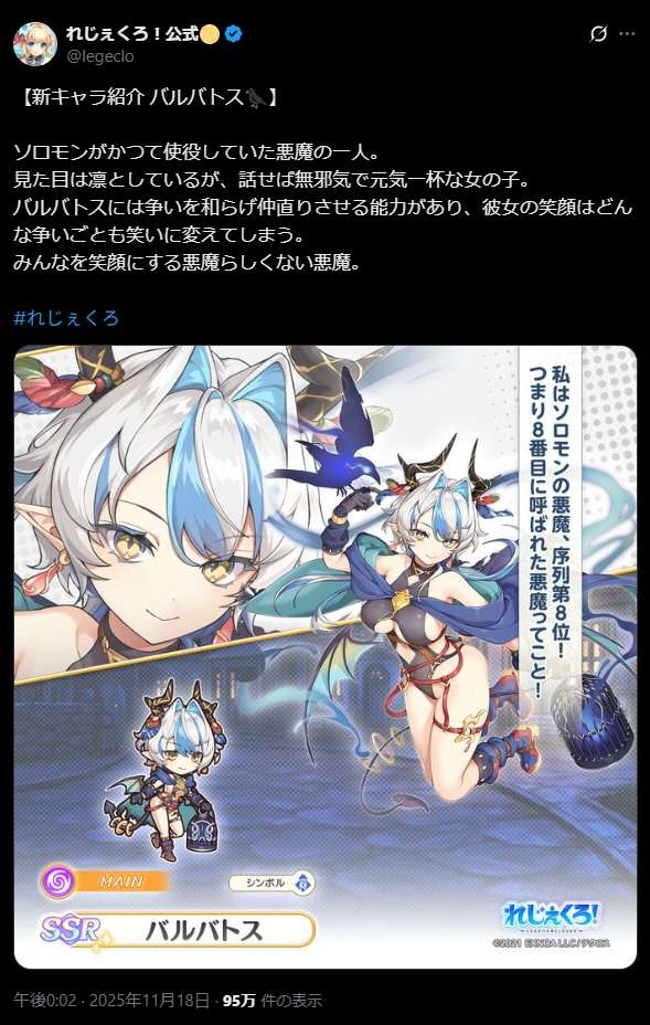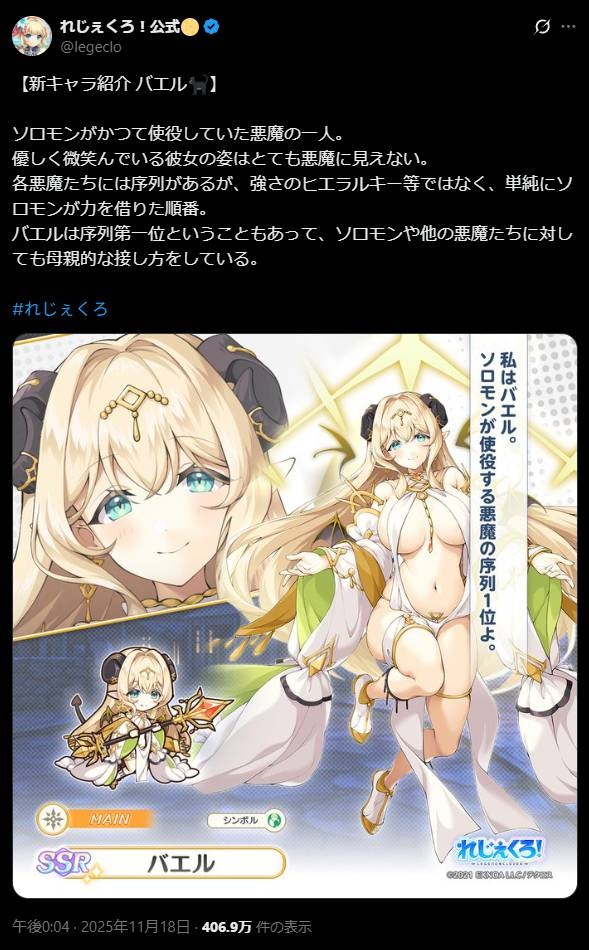 DMM GAMESのアプリ『れじぇくろ!』公式X(旧Twitter)にて11月18日、新キャラクター「バエル」が公開。セ...
