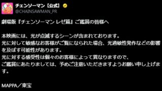 芸スポ 『チェンソーマン』最新映画、公式が注意喚起「光が点滅するシーンが含まれております」ファン驚き「観に行けない」の声も