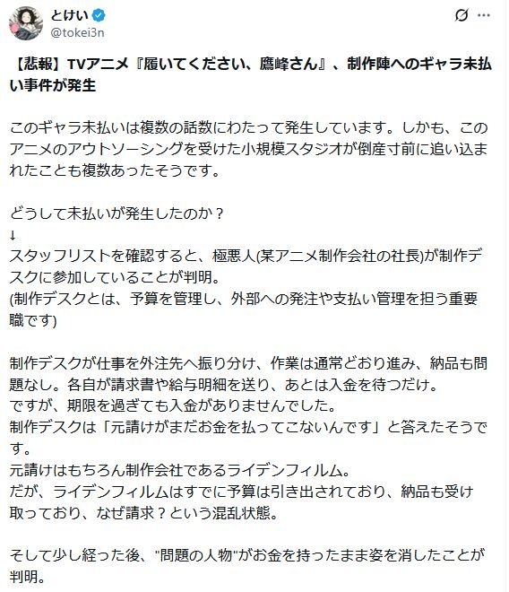 TVアニメ『履いてください、鷹峰さん』、制作陣へのギャラ未払い事件が発生